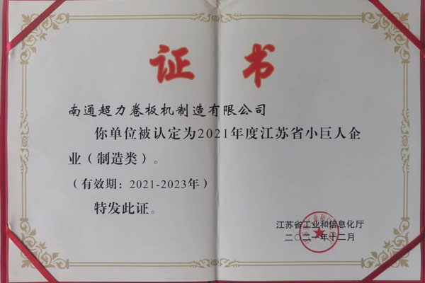 超力卷板機獲2021-2023年度江蘇省小巨人企業證書